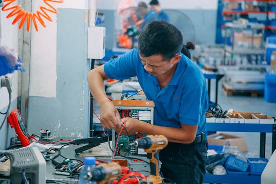 实践团走访了力源整流器集团,该集团是一家国家级高新技术公司,致力于直流电流、高频开关电源等节能产品的研发和生产。调研团队先后来到该公司的作业车间参观加工流程,并与现场工人交流。该公司在发展中逐步形成了以科创中心为支点,以人才战略为抓手的产业发展模式,狠抓创新,打破了国际同行在脉冲电源领域垄断,在PCB电镀电源领域形成独树一帜的产品体系。在当地政府的积极引导下,为实现企业利润和社会效益的结合,力源集团逐步将生产基地从东莞转移到九江,形成了规范化、高效化的现代“生产—监督—销售”管理体系。