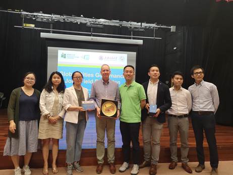 随后进入领取证书、赠予纪念品环节。“全球城市治理”联合实践营的营员们依次上台领取结营证书,并合影留念。国务学院团委书记李锦红上台赠予蔡俊威博士、谢玮赠予Darryl Jarvis上海交大纪念品,并合影留念。