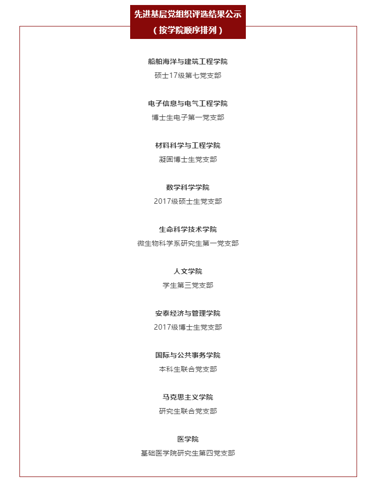 支部曾作为交大唯一的本科生支部入选教育部“全国高校党建工作样板支部”,入选了学校首批党建“双创”(基层党组织)培育计划,与江川路街道长期合作的“香樟家园忘年交”项目也入选了2019年学生党支部“共行计划”,支部也获得了江川路街道“优秀公益团队”称号。支部成员中也涌现了一批先进,如“挑战杯”一、二等奖的获奖团队,必赢中国官方网站十大三好学生标兵等荣誉称号。