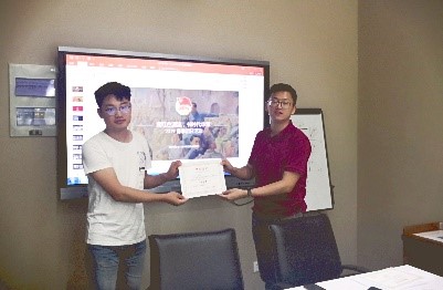 最后从活动组织、参与度、成效、宣传以及答辩情况五个打分点,综合各支部互相评分以及评委的评分结果,18级硕士生团支部“青春心向党,奋斗中国梦”项目获学院春季主题团日活动一等奖,16级本科生联合支部“写祝福,庆祖国华诞;访钱图,愿青年自强”活动获二等奖,17级硕士生团支部“青春心向党,建功新时代”获三等奖,杨树飞为获奖团支部书记颁发奖状。