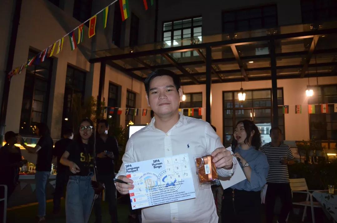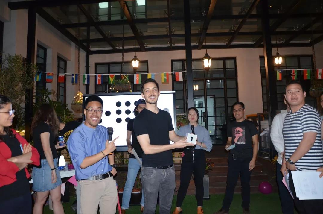 伴随着欢快的开场曲,主持人Matt和曹玉洁在欢呼声中为大家介绍了本次活动的游戏内容和规则。随后,同学们在欢声笑语中进行了语言护照(Language passport)、Bingo、口齿不清(Chubby bunny)、传电话(Telephone)四个有趣的语言小游戏。游戏过程中同学们纷纷踊跃参与到中国、意大利、西班牙、土耳其、法国、韩国六个不同国家的圆桌讨论中,向每一个国家圆桌的“本国老师“”认真学习发音并进行有趣的文化交流,现场气氛十分热烈。游戏胜利的同学都获得了精美小礼品,其中最先完成了Bingo游戏里找到会打太极的同学、有六块腹肌的同学、去过10个国家的同学等九个不同的有趣任务的来自巴西的Pedro获得了最后的冠军奖品:小米手环,大家纷纷对其表示祝贺。
