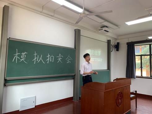 上午10点,拍卖会准时开始。课程第二小组提供了八件“有故事”的拍品,并分别对拍品背后的故事进行了生动的讲述。参与竞拍的同学们对这八件拍品表现出浓厚的兴趣,积极向拍品主人提问以进一步了解拍品。在竞拍环节,叫价声音此起彼伏,价格不断攀升,八件拍品最终都以较高的成交价成功拍卖。整个拍卖会既凸显了严格的流程规范,又兼具趣味性和创意性,给予了同学们很好的活动参与体验,获得了同学们的广泛认可。