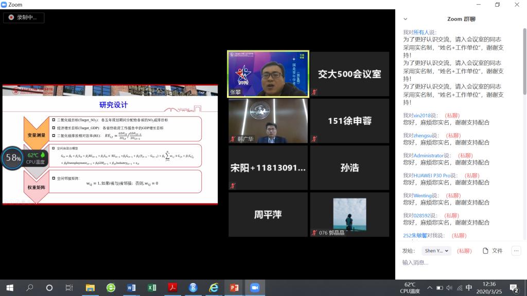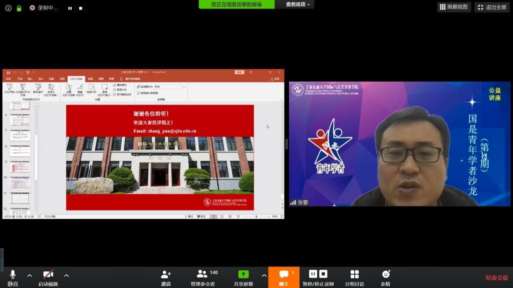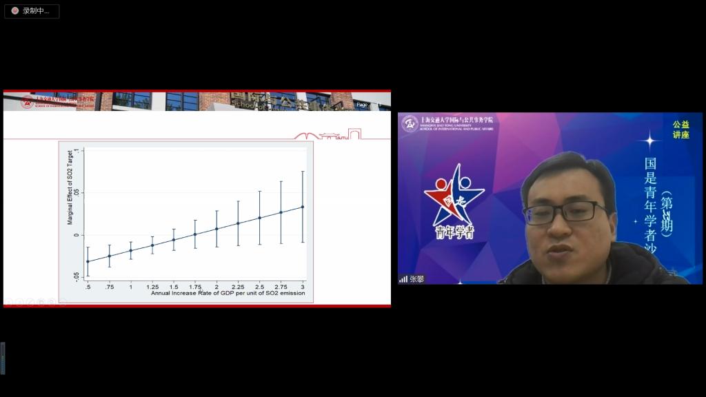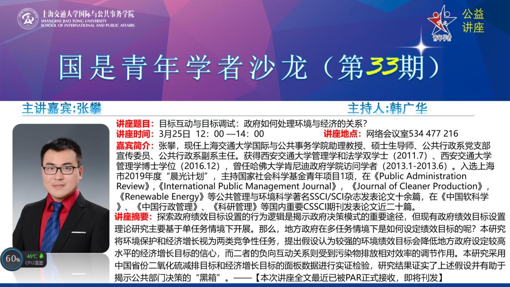 3月25日中午,必赢中国官方网站公益讲座暨第33期国是青年学者沙龙如期举行,学院助理教授张攀以“目标互动与目标调试:政府如何处理环境与经济的关系?”为题,与在线150多名听众进行交流。本次活动由必赢中国官方网站院长助理韩广华副教授主持。