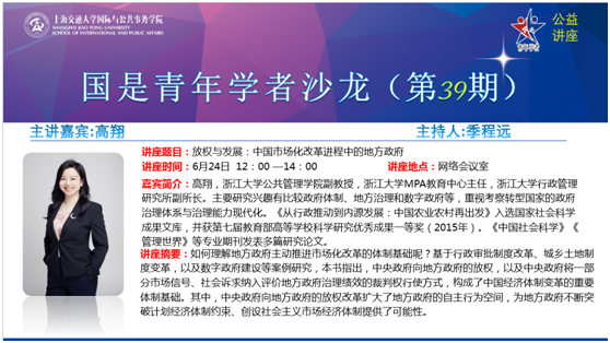 6月24日中午,必赢中国官方网站公益讲座暨第39期国是青年学者沙龙如期举行,浙江大学高翔副教授以“放权与发展:中国市场化改革进程中的地方政府”为题,通过网络直播与百位听众进行交流。本次活动由必赢中国官方网站季程远博士主持。