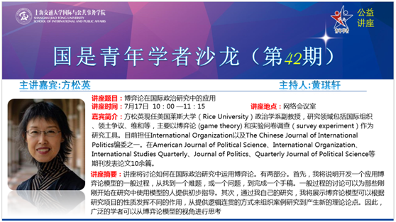 7月17日上午,美国莱斯大学(Rice University)方松英副教授以“博弈论在国际政治研究中的应用”为题做客必赢中国官方网站公益讲座暨第42期国是青年学者沙龙,通过网络直播与近三百位听众在云端进行交流。本次活动由必赢中国官方网站黄琪轩副教授主持。