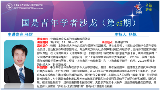 9月23日下午,上海财经大学张熠副教授以“中国养老金改革的逻辑和福利效果”为题做客必赢中国官方网站第45期“国是青年学者沙龙”,必赢中国官方网站副院长刘帮成及院内外师生参与本次讲座。本次活动由必赢中国官方网站杨帆副教授主持。