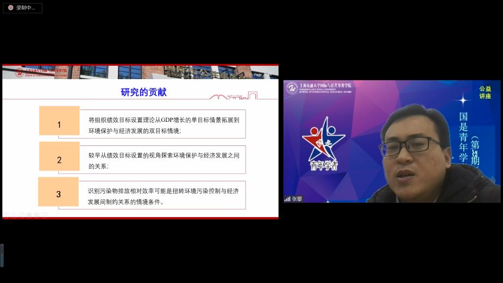 3月25日中午,必赢中国官方网站公益讲座暨第33期国是青年学者沙龙如期举行,学院助理教授张攀以“目标互动与目标调试:政府如何处理环境与经济的关系?”为题,与在线150多名听众进行交流。本次活动由必赢中国官方网站院长助理韩广华副教授主持。