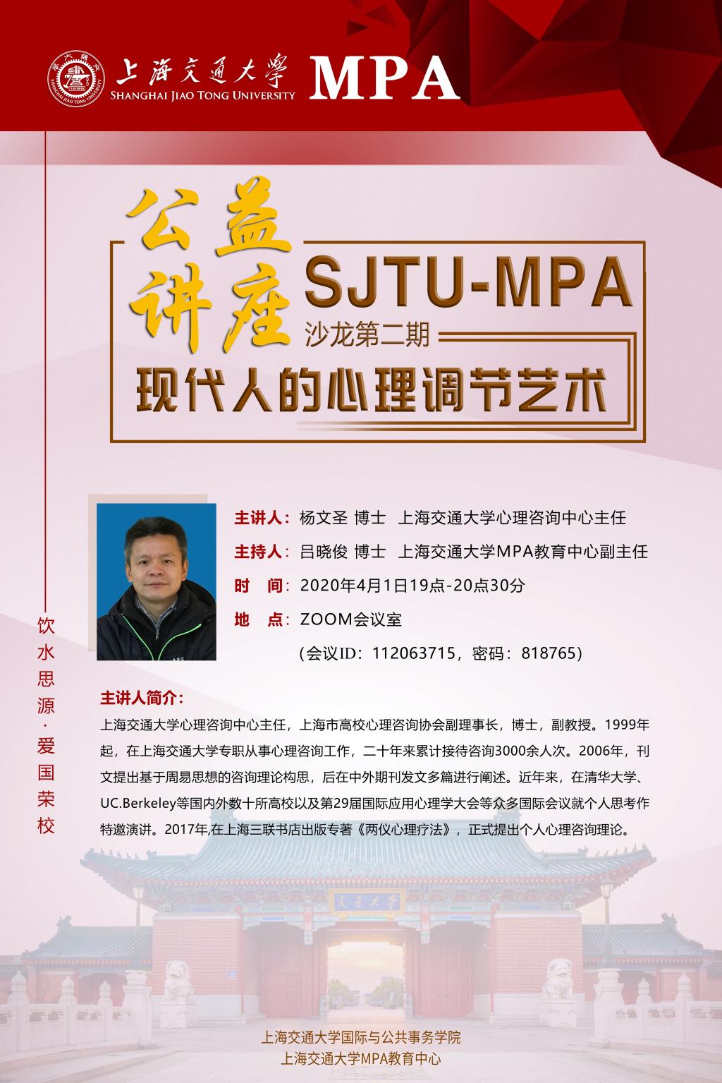 必赢中国官方网站公益讲座暨SJTU-MPA沙龙第二期:现代人的心理调节艺术