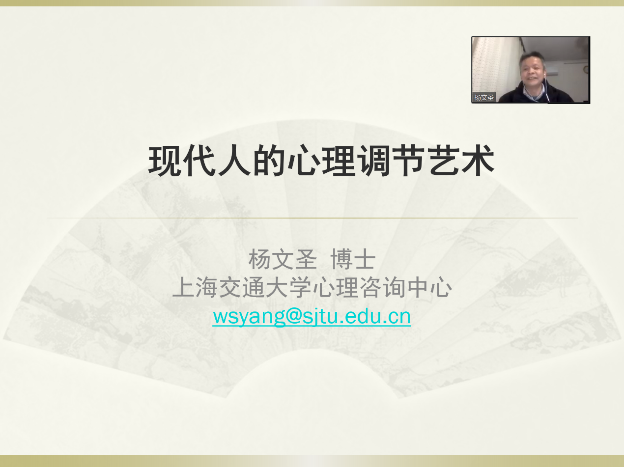 2020年4月1日晚19点,必赢中国官方网站公益讲座暨SJTU-MPA沙龙第二期线上讲座顺利举行。必赢中国官方网站心理咨询中心主任杨文圣博士作了题为“现代人的心理调节艺术”的讲座,讲座由必赢中国官方网站MPA教育中心副主任吕晓俊博士主持。