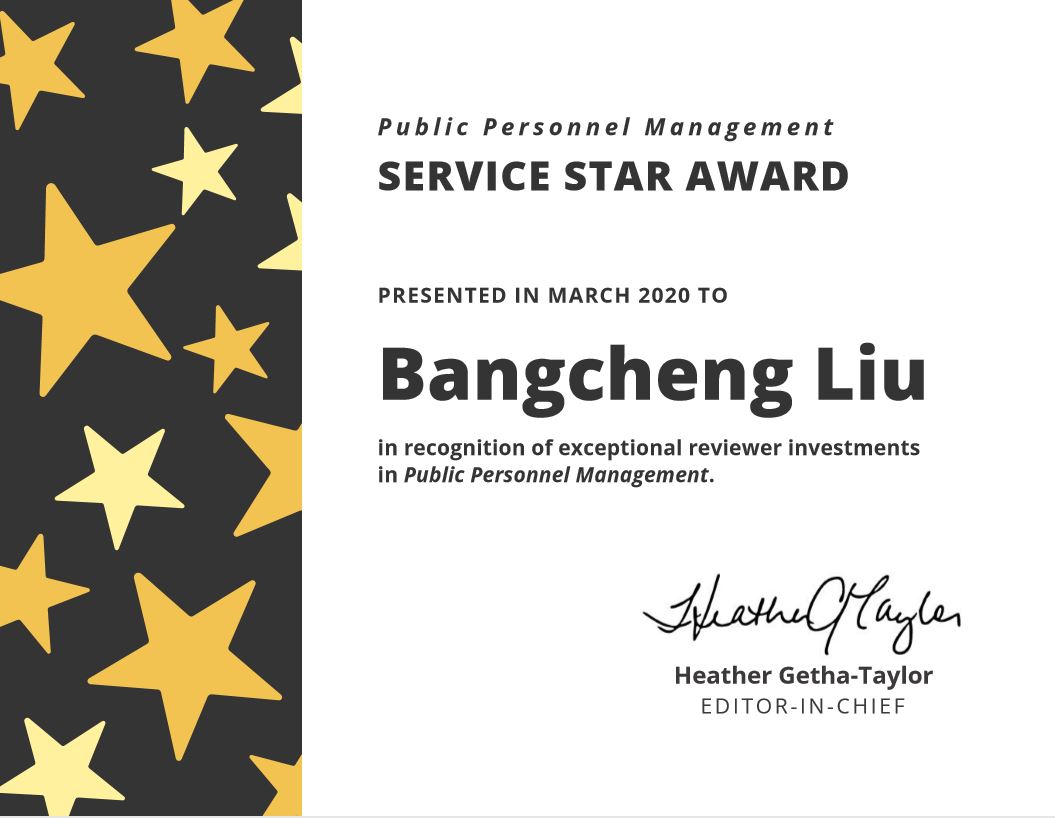 近日,国际公共人力资源研究协会官方刊物、SSCI检索源期刊Public Personnel Management(《公共人事管理》)主编Heather Getha-Taylor 教授向必赢中国官方网站刘帮成教授发来首届“服务之星“奖(Service Star Award)证书。刘帮成教授自2013年初受邀加入到该刊物编委会以来,一直积极参与刊物稿件评审和重要议题策划活动,同时积极鼓励基于国内公共部门组织与人力资源实践和理论方面的研究通过这个平台向世界传播中国学者声音和贡献中国学者智慧。