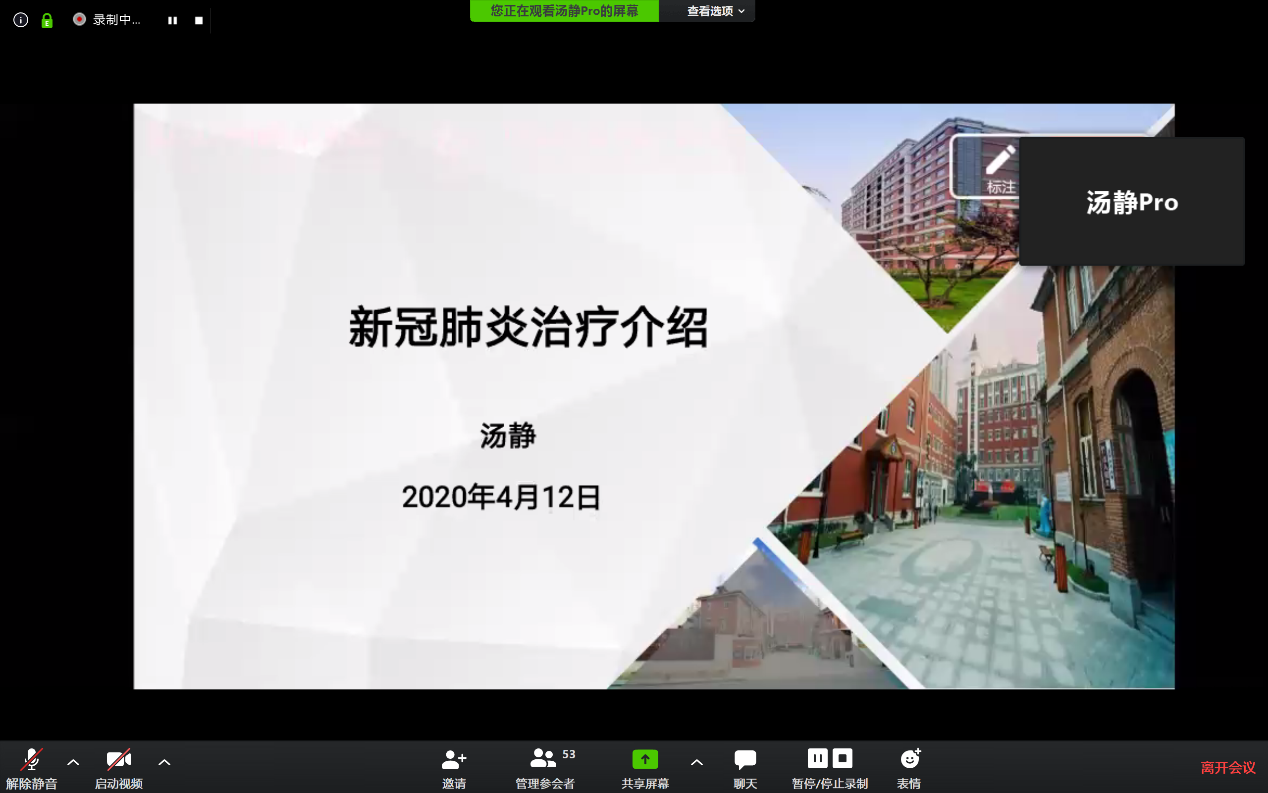 首先,汤静围绕“新冠肺炎药物治疗”的主题,立足上海市新冠肺炎诊疗现状,介绍了上海公立医院针对新型冠状肺炎开启的互联网线上服务,并详细说明了目前“抗病毒药物治疗”、“抗菌药物治疗”、“免疫治疗”、“糖皮质激素治疗”和“中药治疗”等针对新型冠状病毒的五种诊疗方案及其效果。汤静建议大家在没有任何感染症状和没有专业医生指导的前提下,不要私自服用任何网上热炒的“特效药”,以免对身体造成不必要的损伤。