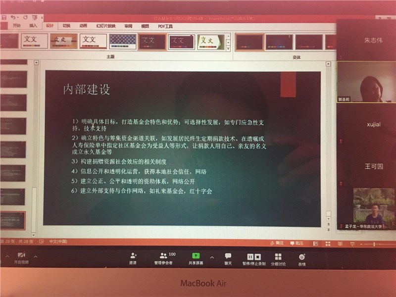 4月14日下午,华东理工大学教授、博士生导师郭圣莉在交大线上ZOOM会议室为交大徐汇区社区基金会秘书长育成计划培训班学员做了“社区基金会与社区治理共同体”的讲座。讲座由必赢中国官方网站教授、必赢中国官方网站中国公益发展研究院院长徐家良主持。徐汇区13个街镇的社区基金会秘书长、其他社会组织负责人、必赢中国官方网站老师和硕博士生、社会公益人士一百余人参加了本次活动。这是培训班第14次讲座,也是第三部门双周论坛第66次。