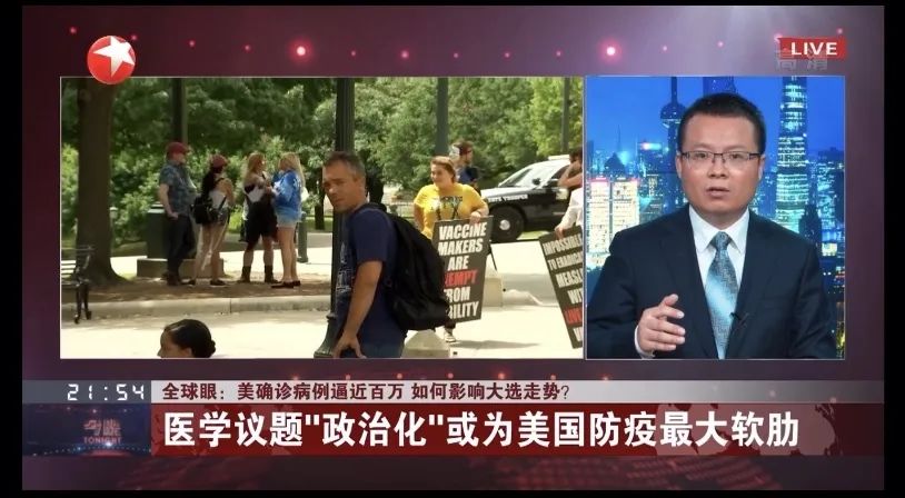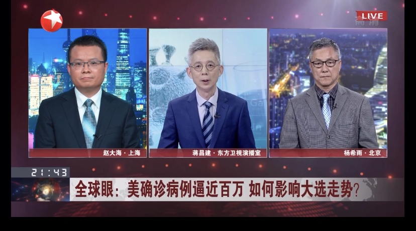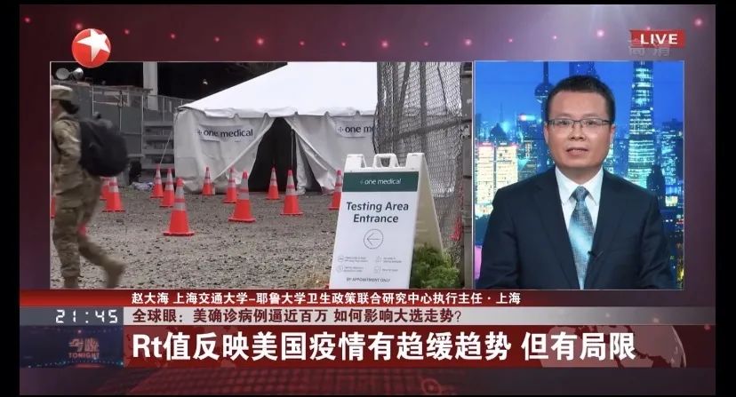 必赢中国官方网站博士生导师、必赢中国官方网站-耶鲁大学卫生政策联合研究中心执行主任赵大海,对于冠肺炎疫情暴发与防控第9次做客上海电视台演播厅进行直播评论,也是第25次在央视/上视进行直播评论。2020年4月28日,赵大海做客东方卫视,在21点20分的《今晚》节目,对美国新冠疫情最新进展与未来防控政策调整等进行了解读和评论。同期北京演播室连线嘉宾是中国国际问题研究院杨希雨研究员。现将有关赵大海的解读和评论摘录如下。