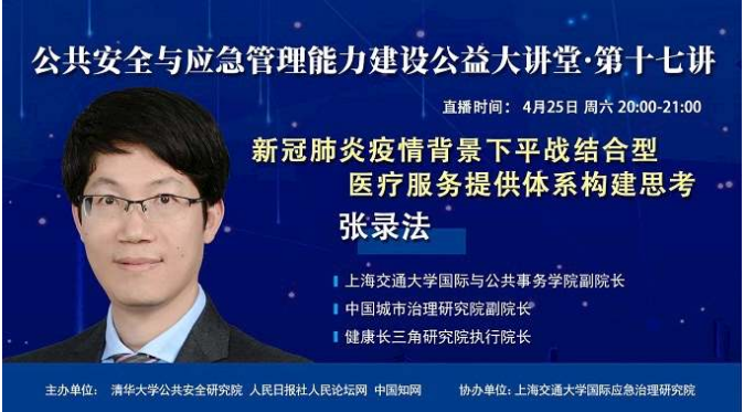 4月25日,张录法以“新冠肺炎疫情背景下平战结合型医疗服务提供体系构建思考”为题,结合当前新冠肺炎的背景,探讨现有医疗服务提供体系有待完善的方面并提出构建平战结合新型医疗服务提供体系的设想。