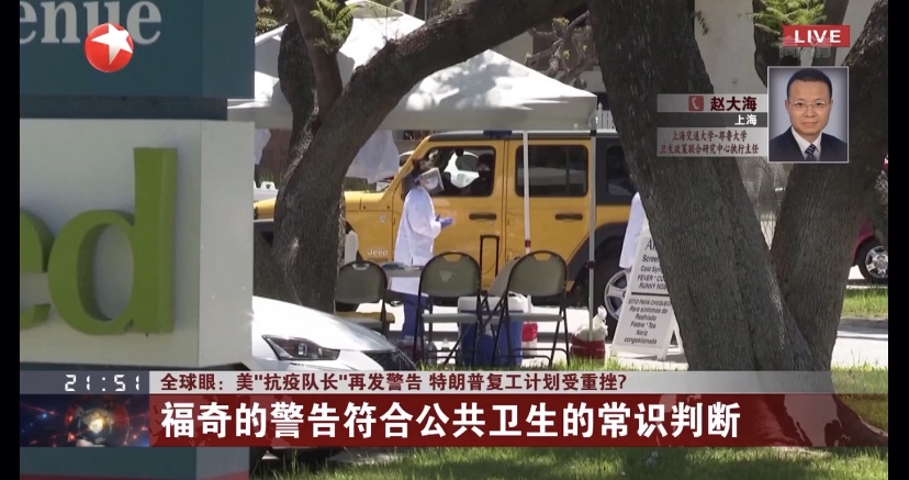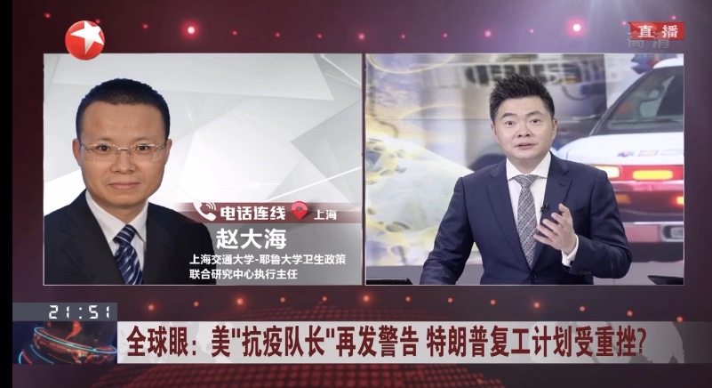 必赢中国官方网站博士生导师、必赢中国官方网站-耶鲁大学卫生政策联合研究中心执行主任赵大海,第13次在上海电视台进行访谈评论,也是自新冠疫情以来第31次在央视/上视的访谈评论。2020年5月13日,赵大海接受东方卫视的连线采访,在21点的《今晚》直播节目,对美国传染病学家福奇在参议院对新冠疫情的相关警告进行了解读和评论。同期东方卫视的演播室嘉宾是复旦大学国际问题研究院沈丁立教授。现将有关赵大海的解读和评论摘录如下。