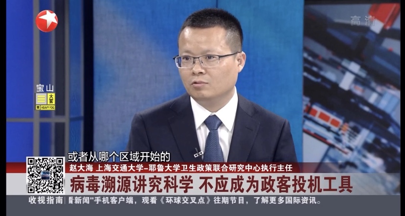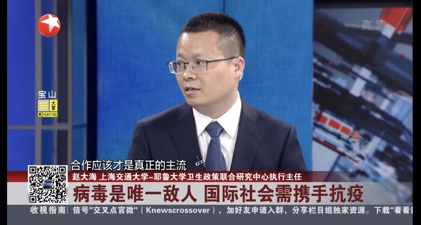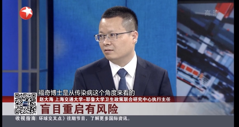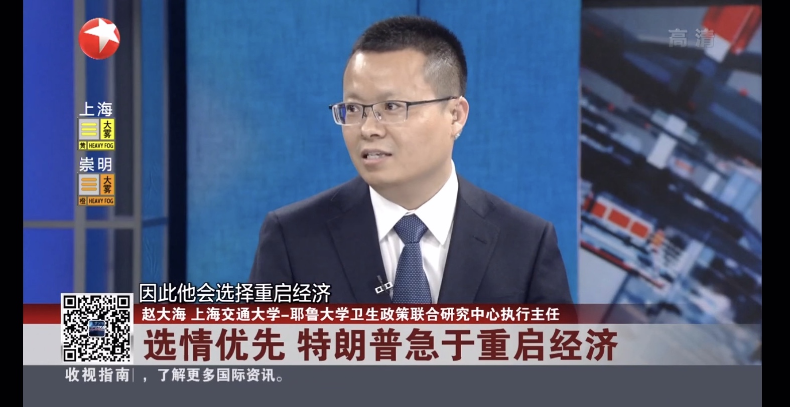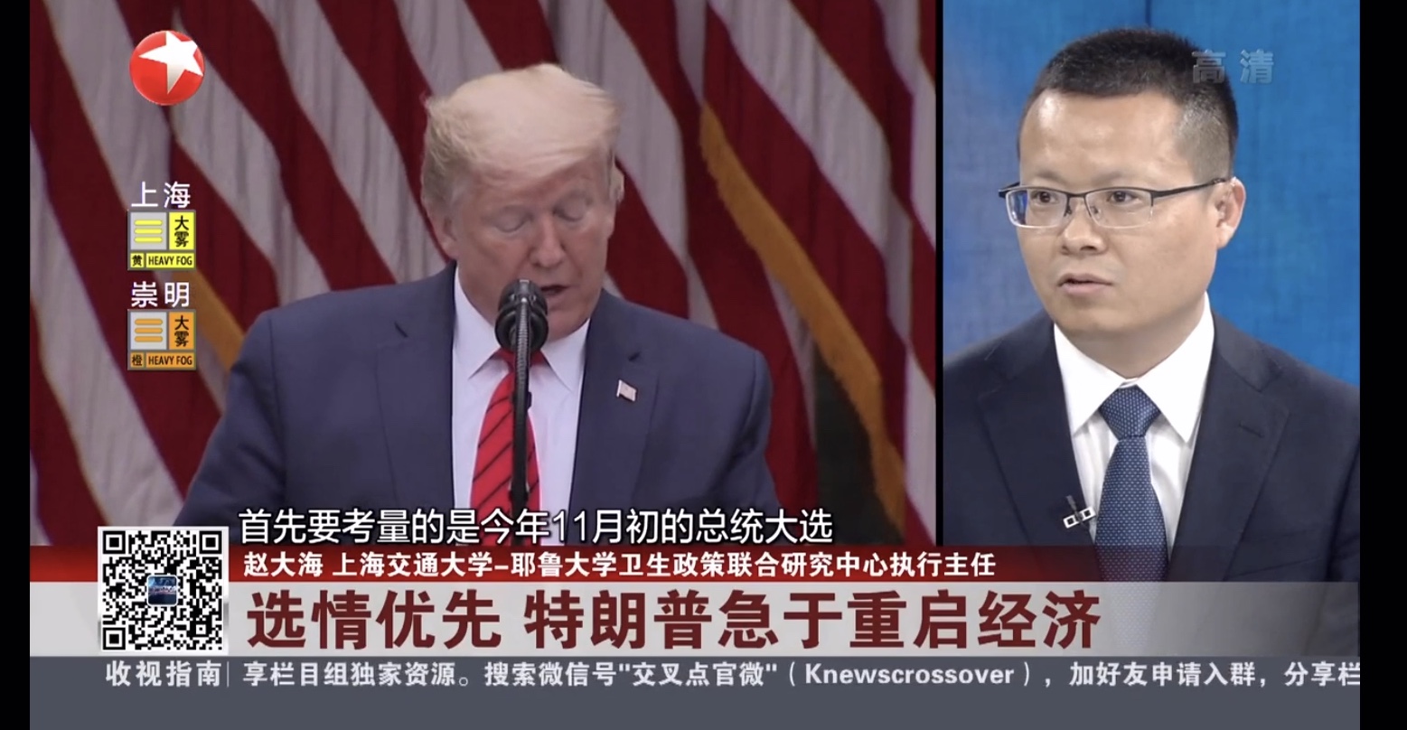 必赢中国官方网站博士生导师、必赢中国官方网站-耶鲁大学卫生政策联合研究中心执行主任赵大海,对于新冠肺炎疫情暴发与防控第14次做客上海电视台演播室进行访谈评论,也是第32次在央视、上视进行访谈评论。在2020年5月17日上午9点的东方卫视《环球交叉点》节目,赵大海就美国经济重启对疫情的影响和中美关系等进行了解读和评论。演播室同期嘉宾是复旦大学国际问题研究院沈丁立教授。现将有关赵大海的访谈内容摘录如下。