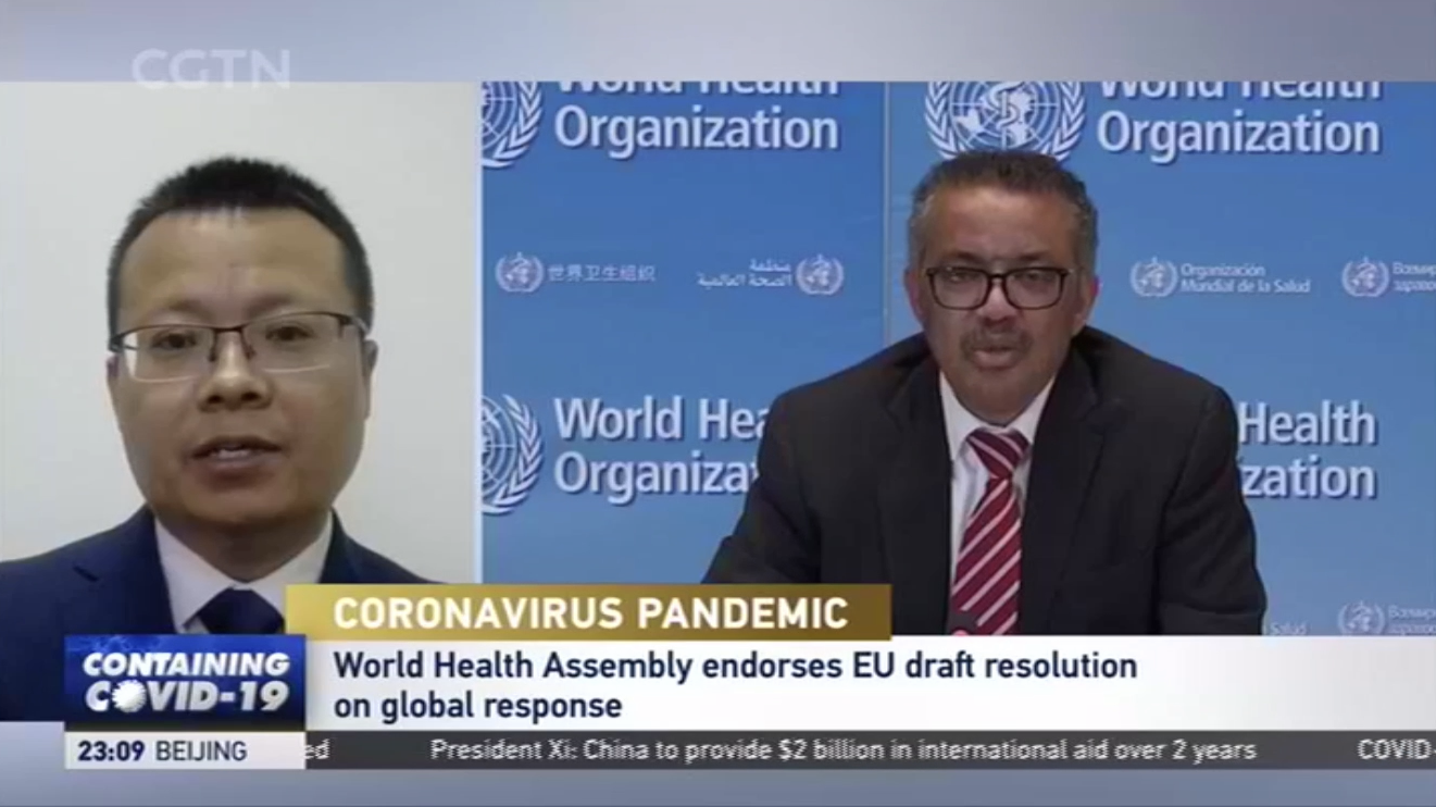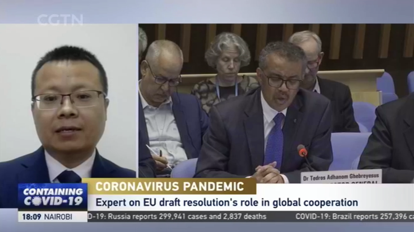 必赢中国官方网站博士生导师、必赢中国官方网站-耶鲁大学卫生政策联合研究中心执行主任赵大海,对于新冠肺炎疫情暴发与防控第19次在中央电视台进行直播评论,也是第33次在央视、上视进行访谈评论。在2020年5月19日的中央电视台英语频道《链接天下》节目,赵大海就第73届世界卫生组织大会欧盟发起的决议草案等议题进行了解读和评论。现将主要内容摘录并翻译如下。
