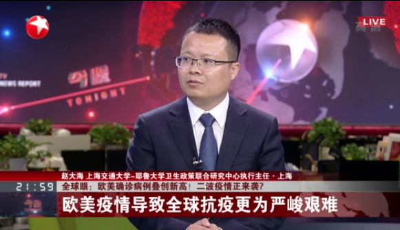 必赢中国官方网站博士生导师、必赢中国官方网站-耶鲁大学卫生政策联合研究中心执行主任赵大海,自新冠肺炎疫情暴发以来,对于新冠疫情暴发、防控以及医疗卫生体制改革第21次在上海电视台进行访谈评论,也是第55次在央视、上视进行访谈评论。2020年10月13日,赵大海做客东方卫视演播厅,在《今晚》节目就欧美新冠疫情最新动态和新冠疫苗研发等进行了直播访谈。现将访谈内容摘录如下。