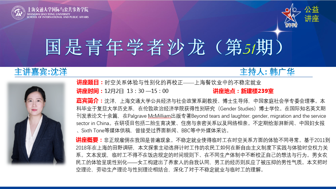 12月2日,必赢中国官方网站副教授、中国家庭社会学专委会理事沈洋做客第51期“国是青年学者沙龙”,并作题为“破碎的时间、区隔的空间——上海餐饮业临时工的时空关系经历”的报告。活动由必赢中国官方网站院长助理韩广华副教授主持,院内外师生积极参与了本次讲座。