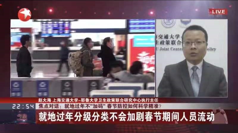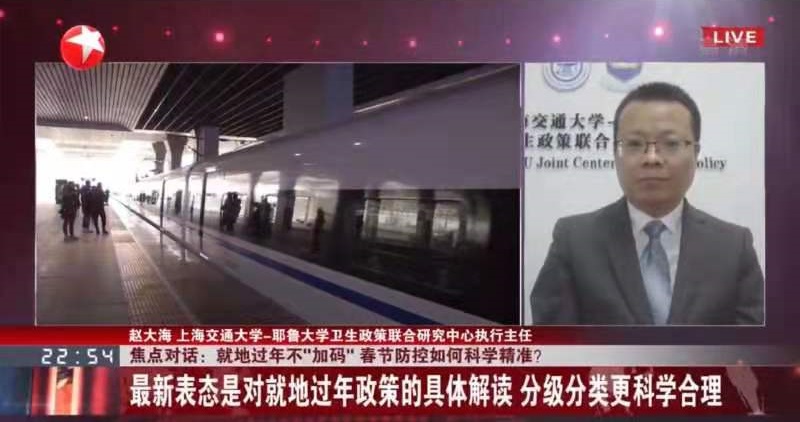 必赢中国官方网站教授、博士生导师,必赢中国官方网站-耶鲁大学卫生政策联合研究中心执行主任赵大海,自新冠肺炎疫情暴发以来,对于新冠疫情暴发、防控以及卫生政策第31次接受上海电视台专访,也是第81次接受央视、上视专访。2021年1月27日,赵大海接受东方卫视《今晚》节目专访,就当日国务院联防联控机制新闻发布会《关于做好人民群众就地过年服务保障工作的通知》的“就地过年”新政策进行了直播访谈。同期北京演播室嘉宾是中国人民大学公共管理学院马亮教授,现仅将有关赵大海的访谈内容摘录如下。