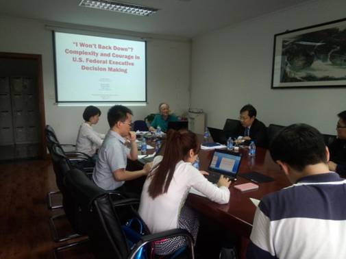 StevenKelman教授首先以美国著名音乐人TomPetty的歌曲“Iwon’t back down”为引子提出了研究问题,即不言退却是否是政府高层领导决策过程的较好方式,随后指出由于个体层次的验证性偏差(ConfirmationBias)和群体层面的趋同思维(Groupthink)的存在而通常认为该方法并不好。基于奥巴马政府20个次内阁部门主官的深度访谈,比较了“优秀”高层领导和随机“控制”组后,发现多数高层官员面临的决策难题并非是复杂的、需要收集各方信息的问题,而是需要勇气的问题,此时决策者更需要自我反省和坚持自己立场;最后,围绕优秀决策者的要求进行了探讨。Kelman教授还介绍了IPMJ情况。