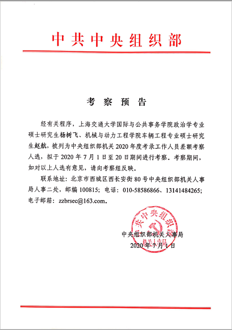 关于国务学院2020届硕士毕业生杨树飞中央组织部考察预告