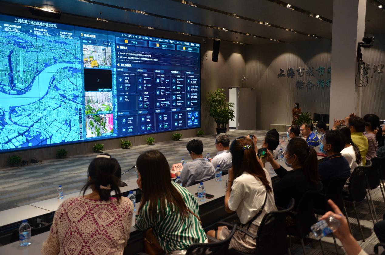 在上海市城市运行管理中心平台所在地,袁镜淞组织讲解了“一块屏里的城市治理”,系统讲述了上海市城市运行管理平台的建设情况,全面展示了城市运行管理系统的运行框架、组织架构、功能模块、应用场景、数据模型、新技术应用、疫情数据监测等情况,详细介绍了城市运行管理系统的问题导向和应用特征。