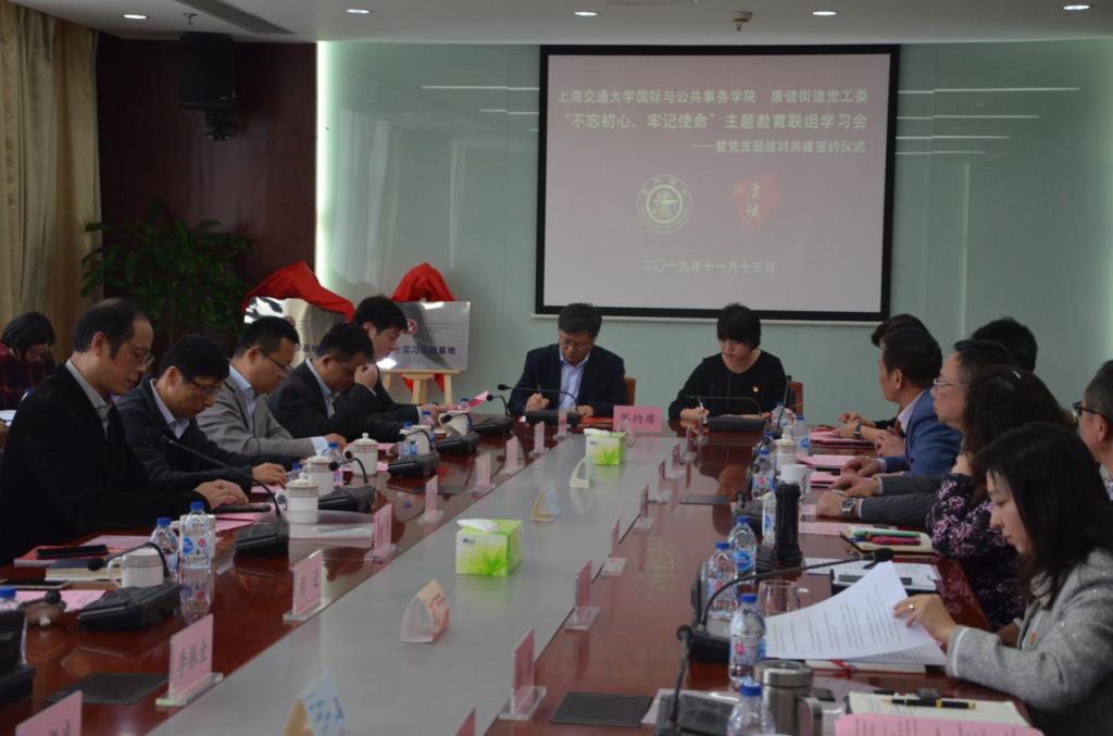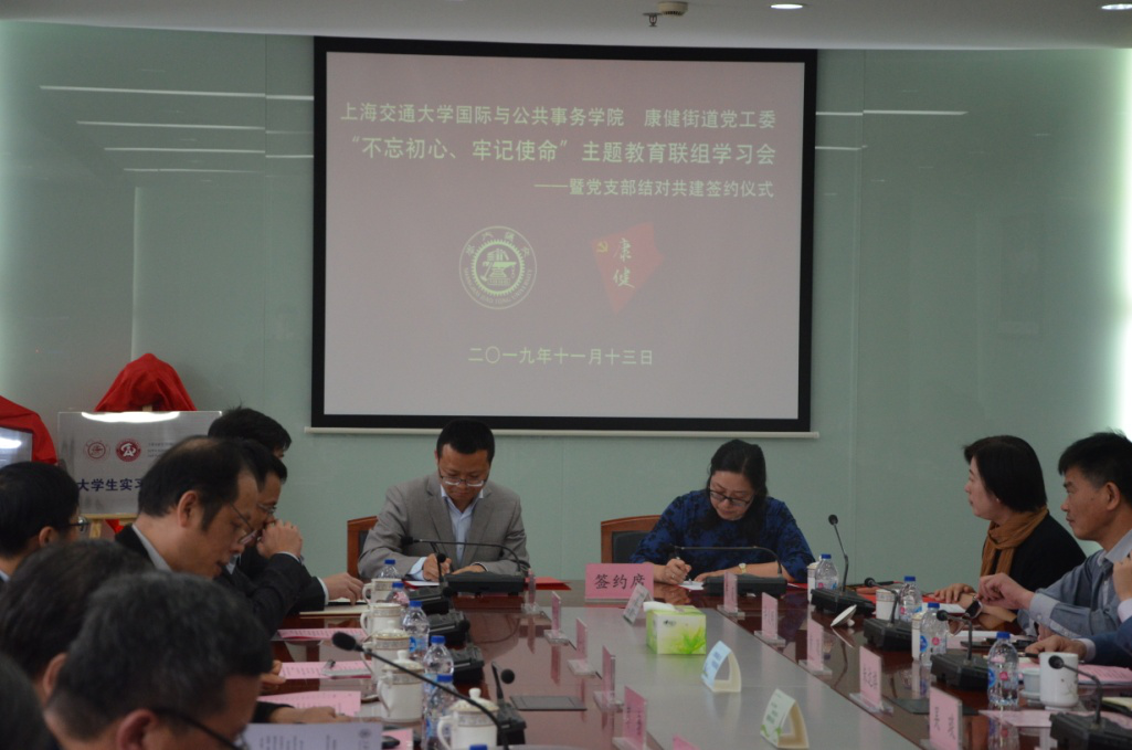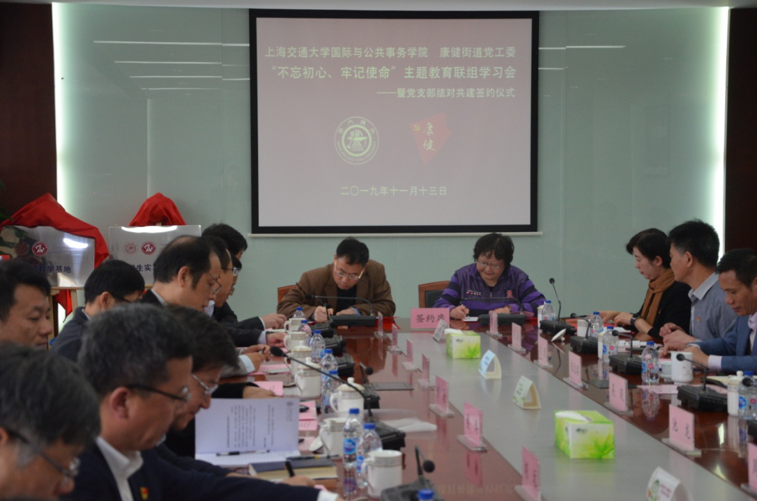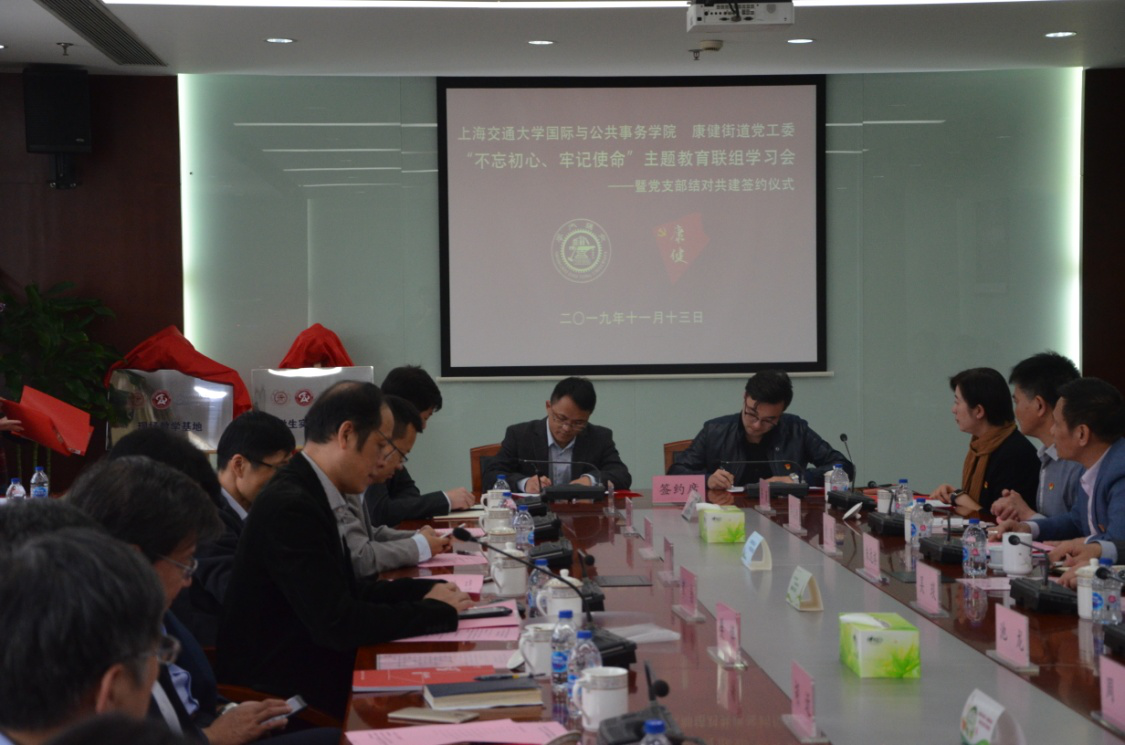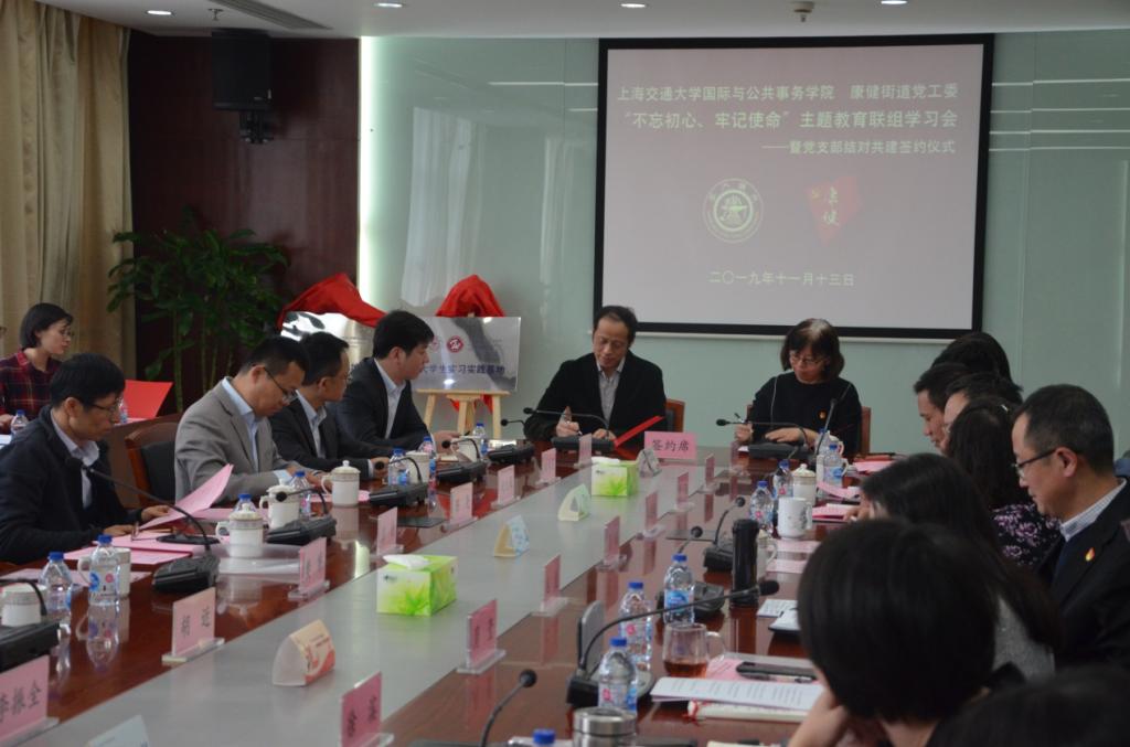 11月13日下午,国务学院和徐汇区康健街道在康健街道办事处会议室举行“不忘初心、牢记使命”主题教育联组学习会暨党支部结对共建签约仪式。康健街道党工委书记、人大工委主任池龙,国务学院代理院长胡近等双方领导班子成员出席会议,学院教师党支部书记、教授代表、康健街道党政办、社区党建办、社区发展办、社区自治办负责人及六个基层党组织书记参加会议。会议由康健街道党工委副书记周莹主持。联组学习会是双方从合作意向走向实质推进的新的转折点,双方全面规划和深入推进合作机制,推动高校发挥社会服务功能,推进街道提升基层治理能效。
