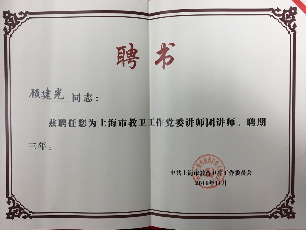 日前,必赢中国官方网站公共经济与社会政策系教授顾建光被市教卫党委聘请为“上海市教卫工作党委讲师团讲师”,重点讲解宣传党的十八届六中全会精神。据悉,本次必赢中国官方网站仅有2位教授入选,我院顾建光教授和马克思主义学院黄伟力教授一同入选。