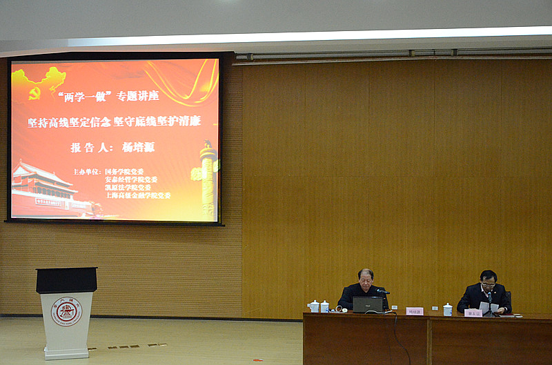 为认真贯彻落实中央和学校党委关于在全体党员中开展“两学一做”学习教育的要求,11月9日下午,国务学院党委、凯原法学院党委、安泰经管学院党委和上海高级金融学院党委共同举办“两学一做”学习教育专题报告会,邀请中共上海市委巡视组原副组长、正局级巡视专员杨培源作“坚持高线坚定信念,坚守底线坚护清廉”专题报告。四个学院有100多名教职工党员参加聆听报告。国务学院党委书记曹友谊主持报告会。
