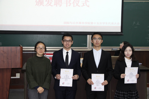 经在场代表投票表决,叶智旸、张弘力、李晶晶当选第十六届团委学生会主席团成员,并在代表们的掌声中完成了新老主席团成员交接仪式。谢玮为他们一一颁发了聘书。在学院团委书记李锦红的领誓下,新一届主席团宣誓就职。