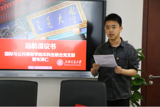 毕业生党员代表普布泽仁向全体成员宣读远航倡议书,2019届毕业学生党员将继续发扬“亮出党员身份”传统,不忘初心使命,为中华民族伟大复兴的中国梦做出自己的贡献。