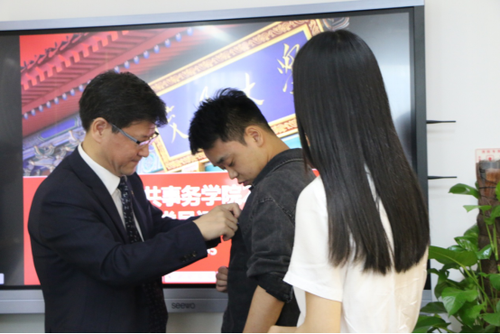 胡近院长和李锦红老师为毕业生党员们佩戴了党徽,提醒毕业生党员无论何时何地,都要时刻牢记党员的身份、责任与使命,做到平常时候看得出来、关键时候站得出来,以实际行动彰显共产党员的先锋模范作用。