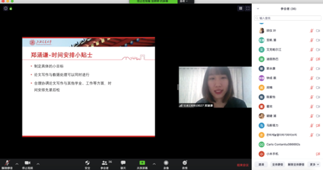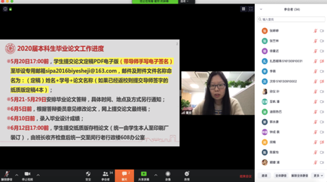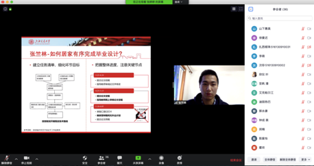 教务办霍欢强调了学院本科毕业论文的整体安排,提醒同学们务必根据时间节点完成毕业论文,建议多与指导老师交流沟通,注意论文规范与诚信规定。班级学生张竺林、郑涵谦先后分享了居家毕设的经验。张竺林严格按照开题报告中的毕业设计路线图以及相关时间节点撰写毕业论文,郑涵谦则每周设立毕业论文小目标来推进论文进度。