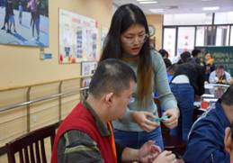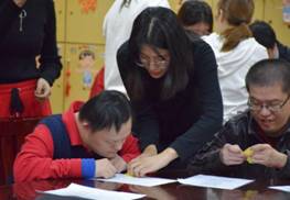 阳光之家的负责人郁甄老师向支部成员介绍了阳光之家的基本情况并组织学员欢迎支部成员的到来,2019级硕士生党支部书记阿力米热组织支部成员与学员们进行结对互动,志愿服务主要围绕唱歌和折纸两项活动展开。